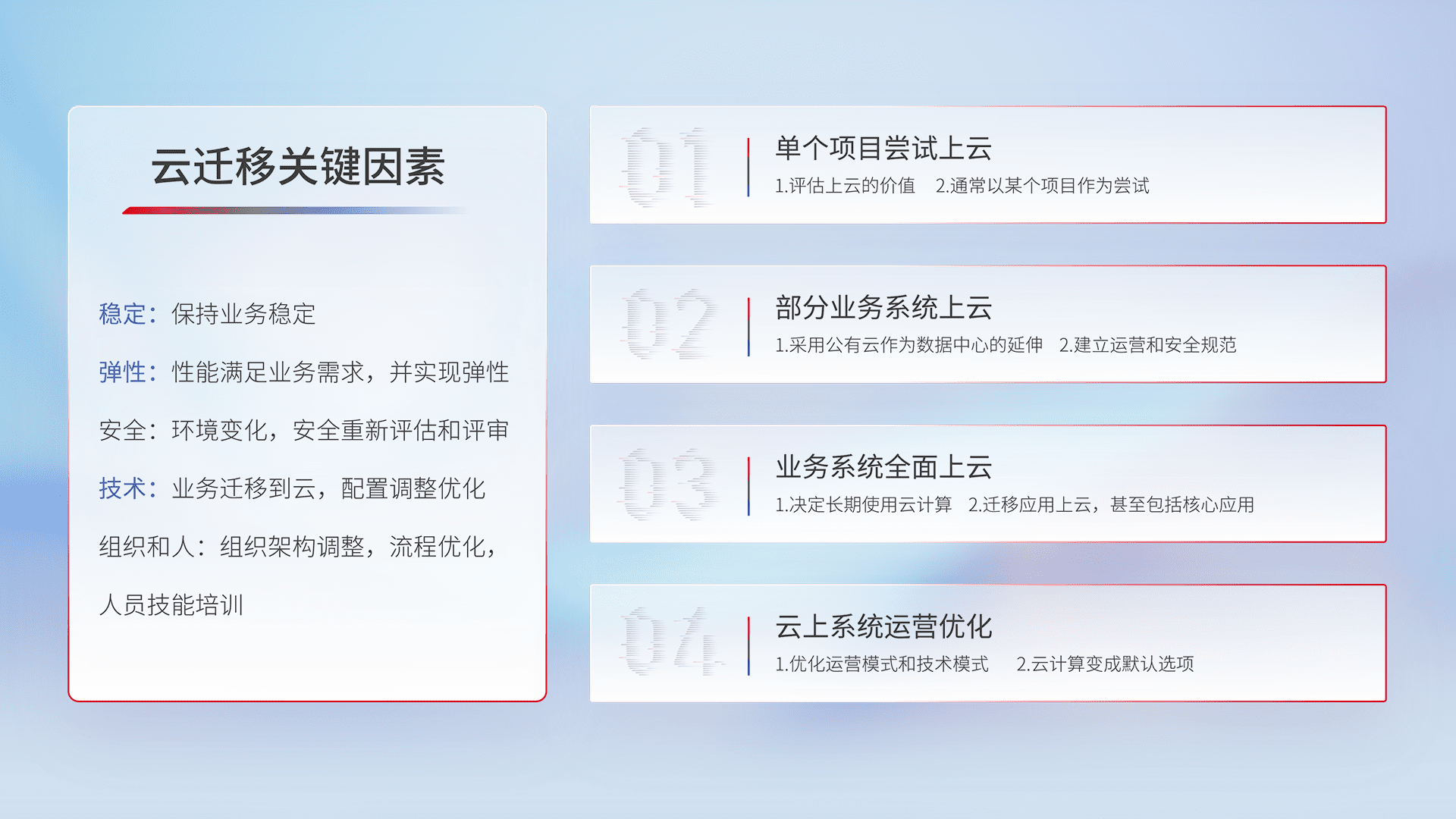 结合实际业务,,,,从规划设计、、、、云平台选型、、云原生改造、、数据迁移、、集成交付,,,,迁移全过程为客户识别最佳上云路径,,,做好风险识别管理,,,,设计网络架构、、身份权限、、安全审计合规、、操作审计、、、、日志审计、、、监控告警策略、、、、多站点容灾设计等,,对云上基础设施进行整体规划,,,,提升IT治理水平,,,以满足弹性、、、、高可用、、、高性能的需求。。。