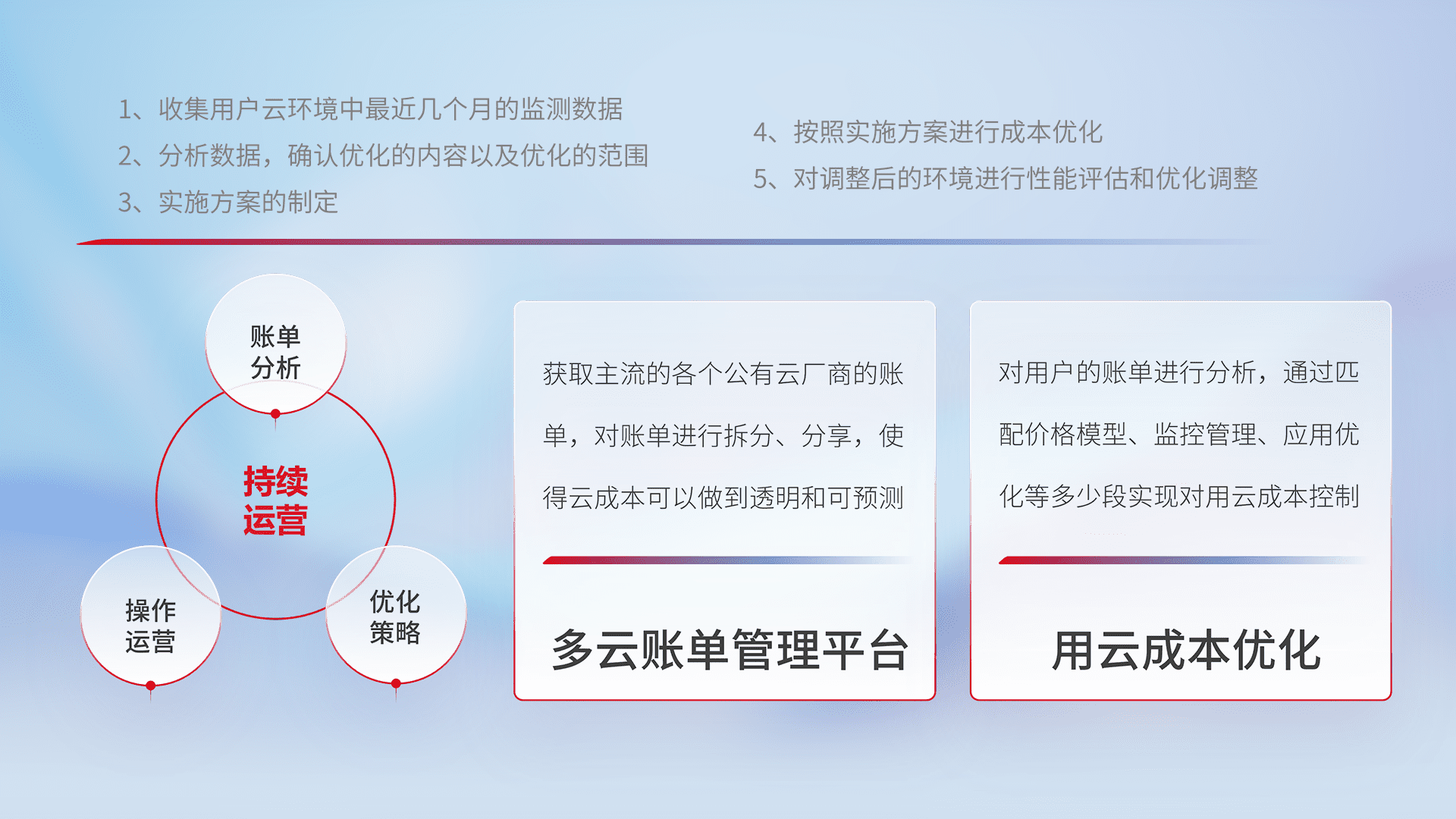 通过多云纳管,,,,以统一的资源数据模型把客户的云资源进行抽象和封装,,进而实现对多云资源的统一操作,,,,保障云资源管理的可靠性、、稳定性与可用性。。量身定制化运维内容,,配置、、、开发运维、、补丁管理、、备份、、监控、、认证和访问管理、、、审计和日常巡检等,,保障在用云过程中的可靠度,,,,稳定度以及高可用率。。。。