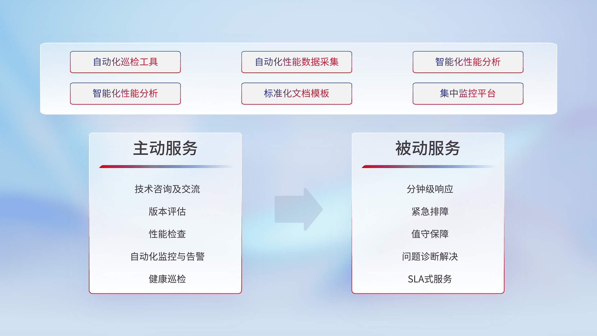 智能化工具和标准化文档,,保障服务质量,,提供主动服务(包含技术咨询、、版本评估、、、性能检查、、、、自动化监控与告警、、健康巡检)和被动服务包含(分钟级响应、、紧急排障、、、、值守保障、、问题诊断解决、、、、SLA服务)。。。